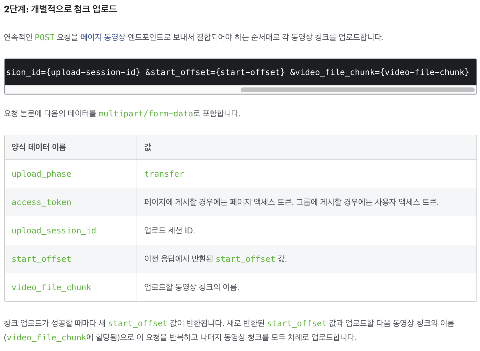 다른 Social Media 서비스 API를 모두 써봤지만 업로드 할 때 이름만 적으라는 설명은 처음봤었다. 보통 일반적으로 영상을 업로드하는 API의 경우 video_file_chunk 라는 키 값에 해당 청크의 버퍼를 넣으면 됐었다. 하지만 페이스북의 경우 실제 분할된 파일이 존재한 상태에서 해당 파일의 경로를 적어줘야 했다.
