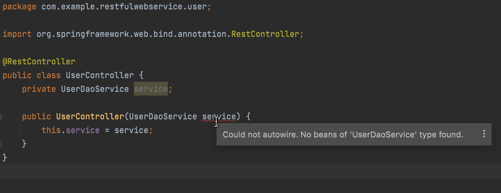 위에서 선언한 UserDaoService의 의존성을 주입하기 위한 생성자를 만드는데 아래와 같은 에러가 발생