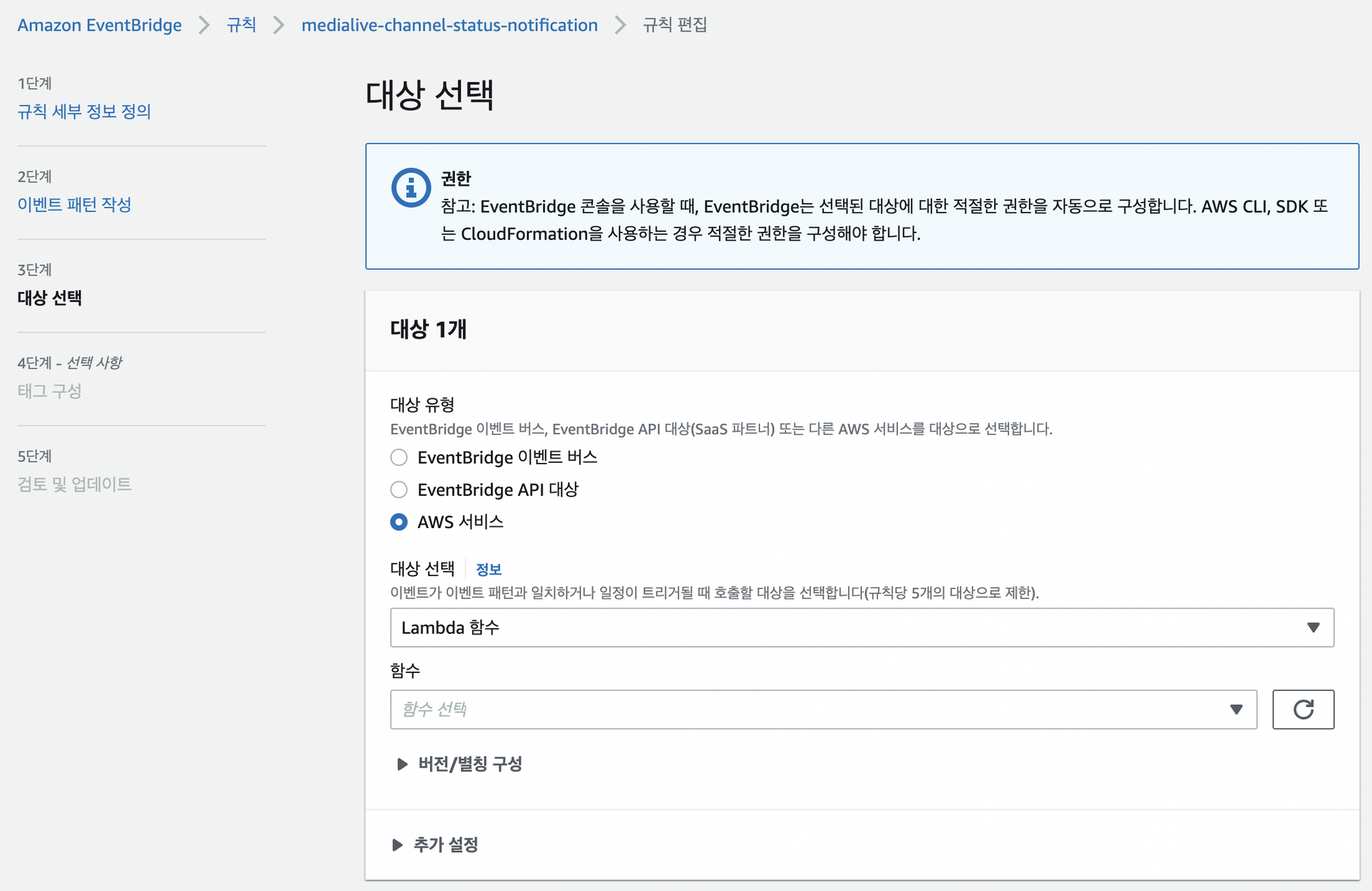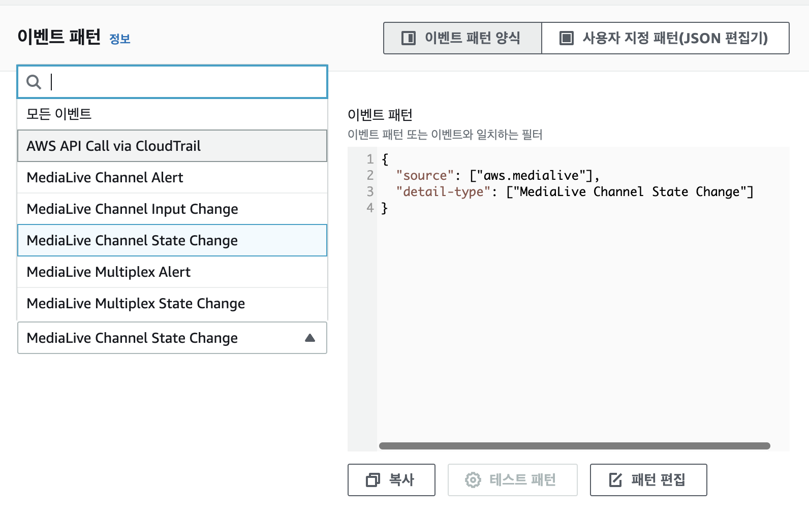간단하게 정리하면 이벤트 브릿지에서 미디어라이브의 채널 이벤트를 수신할 규칙을 생성하고 해당 규칙에 트리거되는 대상을 람다 함수로 지정하면 원하는 부분이 모두 해결될 것으로 예상됐다.