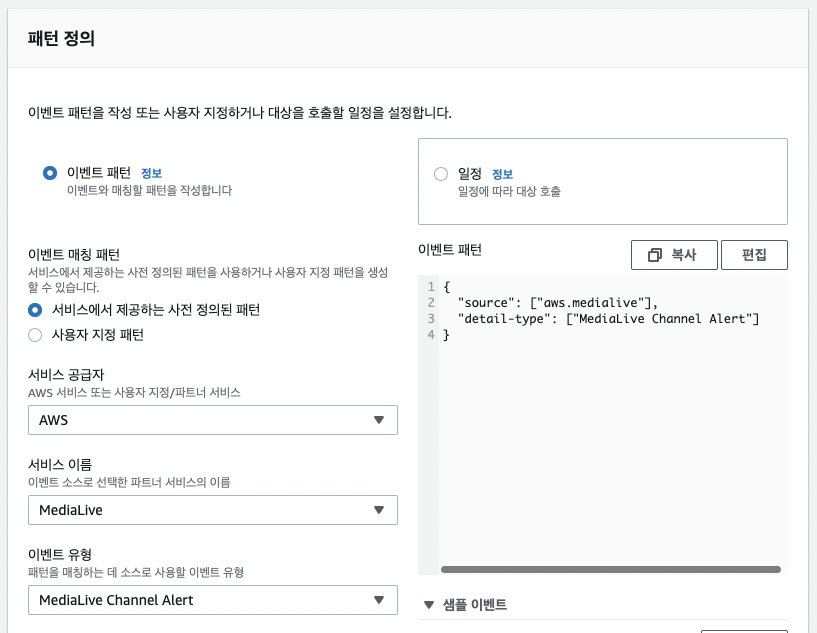 - 해당 항목이 이벤트브릿지와 연결하는 옵션으로 어떤 이벤트의 서비스를 지정할지 패턴과 디테일 타입을 입력한다.