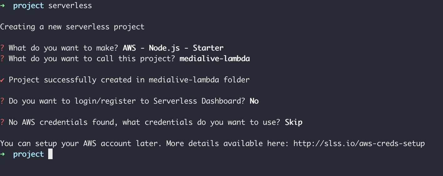 필자는 이 상황에 이미 모두 진행한 부분이여서 Dashboard 선택 여부나 AWS Credentials 설정하는 부분은 No를 선택해서 스킵했다.