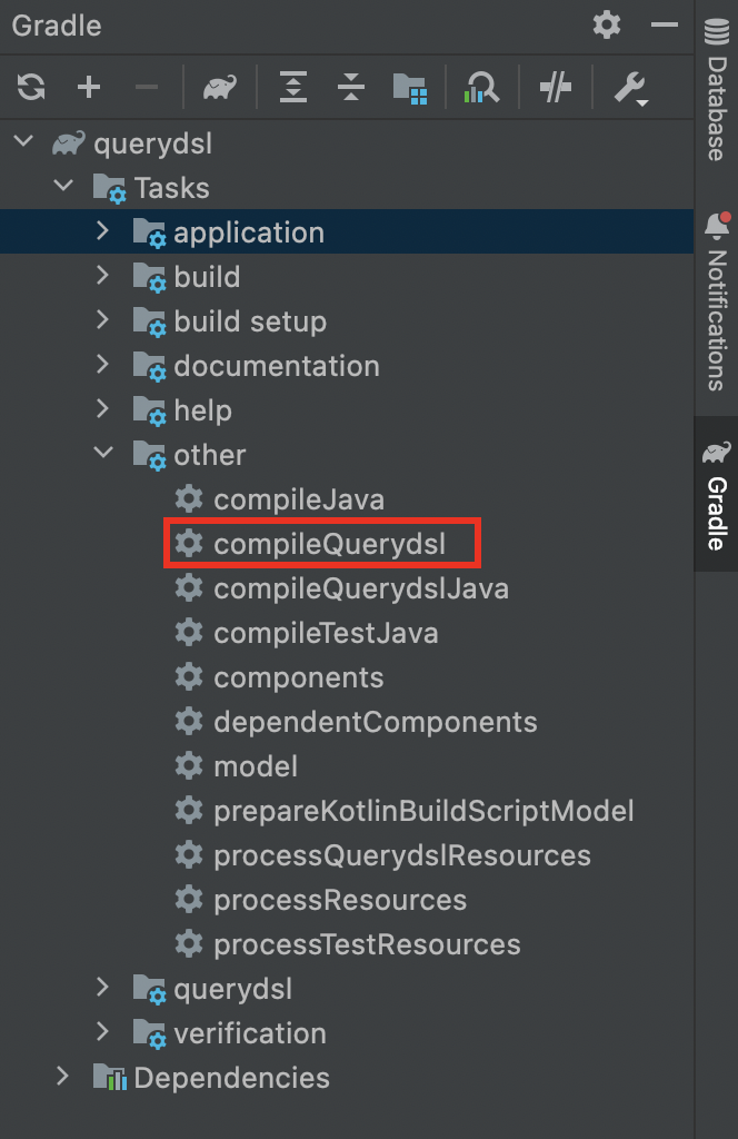 위에서 build.gradle을 수정하고 정상적으로 패키지들이 로드되어서 Querydsl 설정이 잘 끝났다면 gradle 메뉴에 Querydsl을 빌드하는 버튼이 생겨야한다.