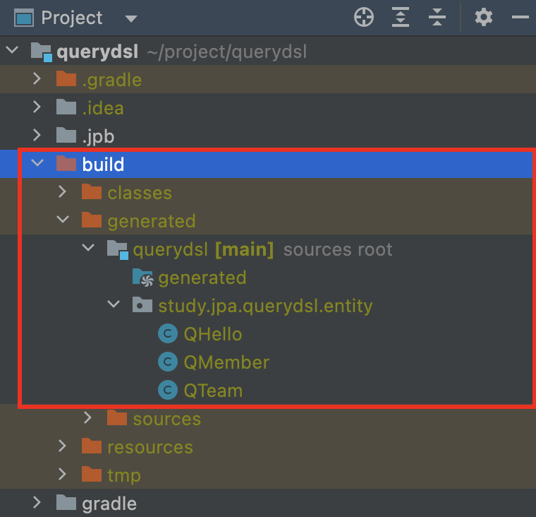 $buildDir은 build 디렉토리를 의미하고 그 하위에 generated/querydsl이란 경로로 결과물이 저장된다.